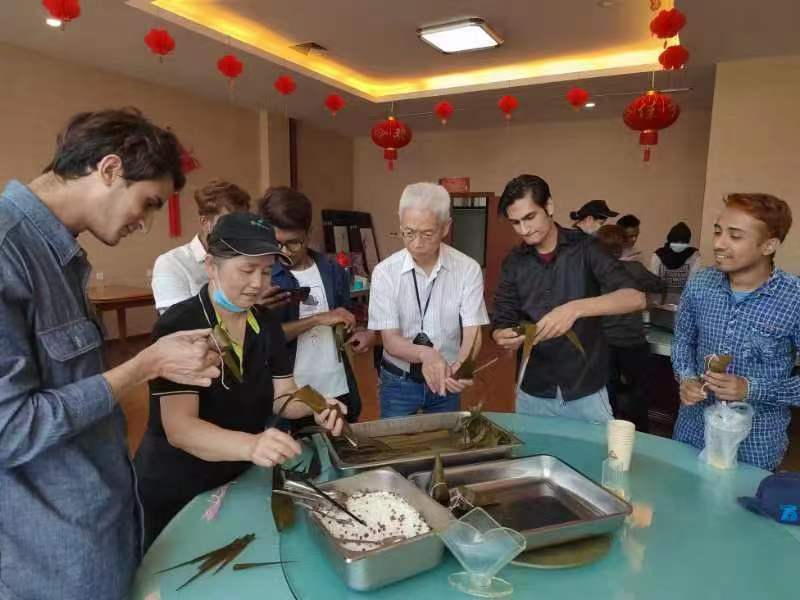 “我很高兴和留学生们一起包粽子过端午,通过活动进一步了解中国传统节日,品尝中国传统美食。”刚包好粽子的日本籍外教岸本宪一兴致勃勃地向身旁的人展示自己的成果。