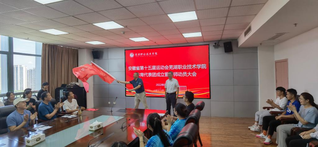 “体育的力量在于凝聚人心,振奋精神”。高武在讲话中指出,学校多年来持续强化体育对于培养德智体美劳全面发展的社会主义建设者和接班人的重要地位,牢固树立“以人为本、健康第一、面向全体、团队学习”的理念,通过实施体育俱乐部制教育教学改革,围绕“教会、勤练、常赛”三个方面,推动体育工作出实效。对于本次学校体育代表团出征安徽省第十五届运动会,他提出了四点希望,一是希望全体教练员、运动员一定要牢记重托、不辱使命,大力弘扬体育精神,努力为学校争光;二是希望大家一定要严肃赛风赛纪,充分展现出安徽省唯一的双高校形象;三是希望有关部门做好服务保障工作,确保万无一失,争取在本届省运会上实现运动成绩和精神文明双丰收;四是希望教练员和运动员们严格按照大赛组委会的要求做好疫情防控工作,确保人身安全。在运动员代表和教练员代表宣誓之后,高武为学校体育代表团授旗,并预祝大家带着优异的成绩从赛场上凯旋归来,为学校增光,为人生添彩。