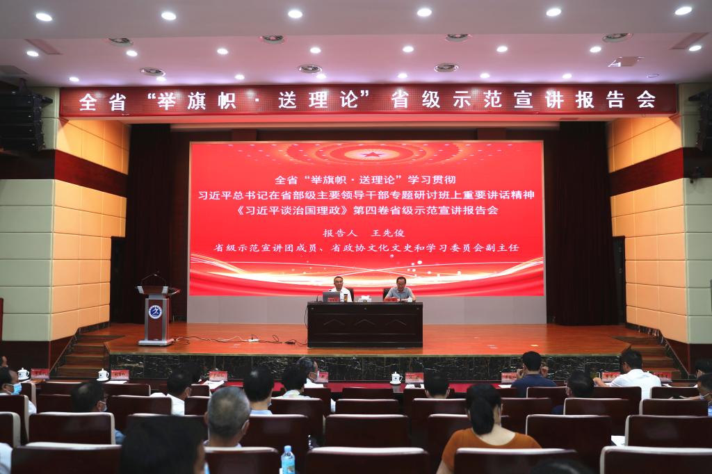 根据省委统一安排,9月14日下午,全省“举旗帜·送理论”学习贯彻习近平总书记在省部级主要领导干部专题研讨班上重要讲话精神、《习近平谈治国理政》第四卷省级示范宣讲报告会暨学校党委中心组(扩大)学习会在文津校区学术报告厅举行。省级示范宣讲团成员、省政协文化文史和学习委员会副主任王先俊教授作专题宣讲报告。省委讲师团主任科员刘杨,芜湖市委宣传部副部长、市人大常委会社会建设工作委员会副主任何世文,学校党政领导班子全体成员出席,报告会由党委书记汪斌主持。